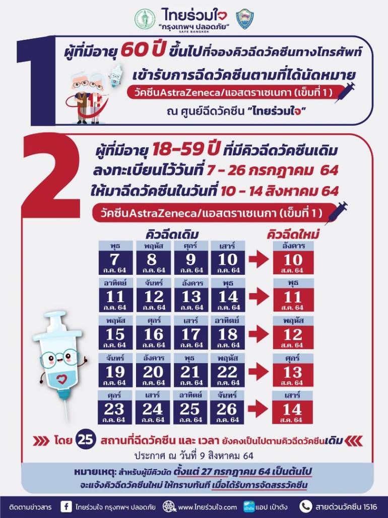 'ธนบุรี เฮลท์แคร์' ผนึก 'ไทยพีบีเอส' เปิดหน่วยฉีดวัคซีน. จอง ฉีดวัคซีน ให้สิทธิ์ผู้ติดตามได้ฉีดด้วย โดยเปิด 5 รอบ จำกัดวันละ 500 คน เช็ค 25 สถานที่ ไทยร่วมใจ กรุงเทพปลอดภัย ฉีดวัคซีนคนกรุง เริ่ม 27 พ.ค. ไทยพีบีเอส เปิดให้ผู้สูงอายุ 60 ปี+ ลงทะเบียน ฉีดวัคซีนโควิด 19 ด้วยการโทร. สถานีโทรทัศน์ไทยพีบีเอส ร่วมกับหอการค้าไทย และโรงพยาบาลธนบุรี จัดตั้งหน่วยบริการฉีดวัคซีนนอกสถานพยาบาลให้กับประชาชน ซึ่งผู้ว่าฯ กทม.ได้.